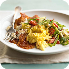 3. For scrambled eggs, in medium bowl whisk together eggs, milk, and 1/4 tsp. each salt and pepper. In large skillet melt remaining 2 tsp. butter over medium heat; add eggs. With spatula, lift and fold partially cooked egg mixture from edges to center so that the uncooked egg portion flows underneath. Continue for 4 to 5 minutes or until eggs are cooked through, but still glossy and moist. Remove from heat.